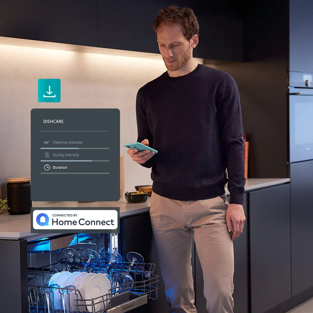 Unlock a range of additional benefits for enhanced convenience, control, and efficiency by connecting your Siemens dishwasher to the Siemens Home Appliance app. Remotely monitor and control your dishwasher from your smartphone or tablet, and start, pause, or adjust settings even when you are not at home. Use the programme assistant to find the correct setting for your load quickly and easily. You can even receive notifications and alerts, access helpful tips and tricks, or even order detergent refills directly from the app.