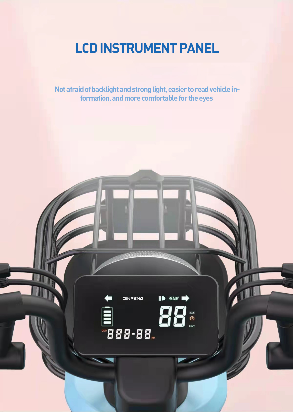 The Jinpeng N8 electric leisure tricycle is designed to provide an exceptional riding experience. combining advanced technology with comfort and safety. Whether for daily commuting. shopping. or family outings. the N8 meets all your needs.