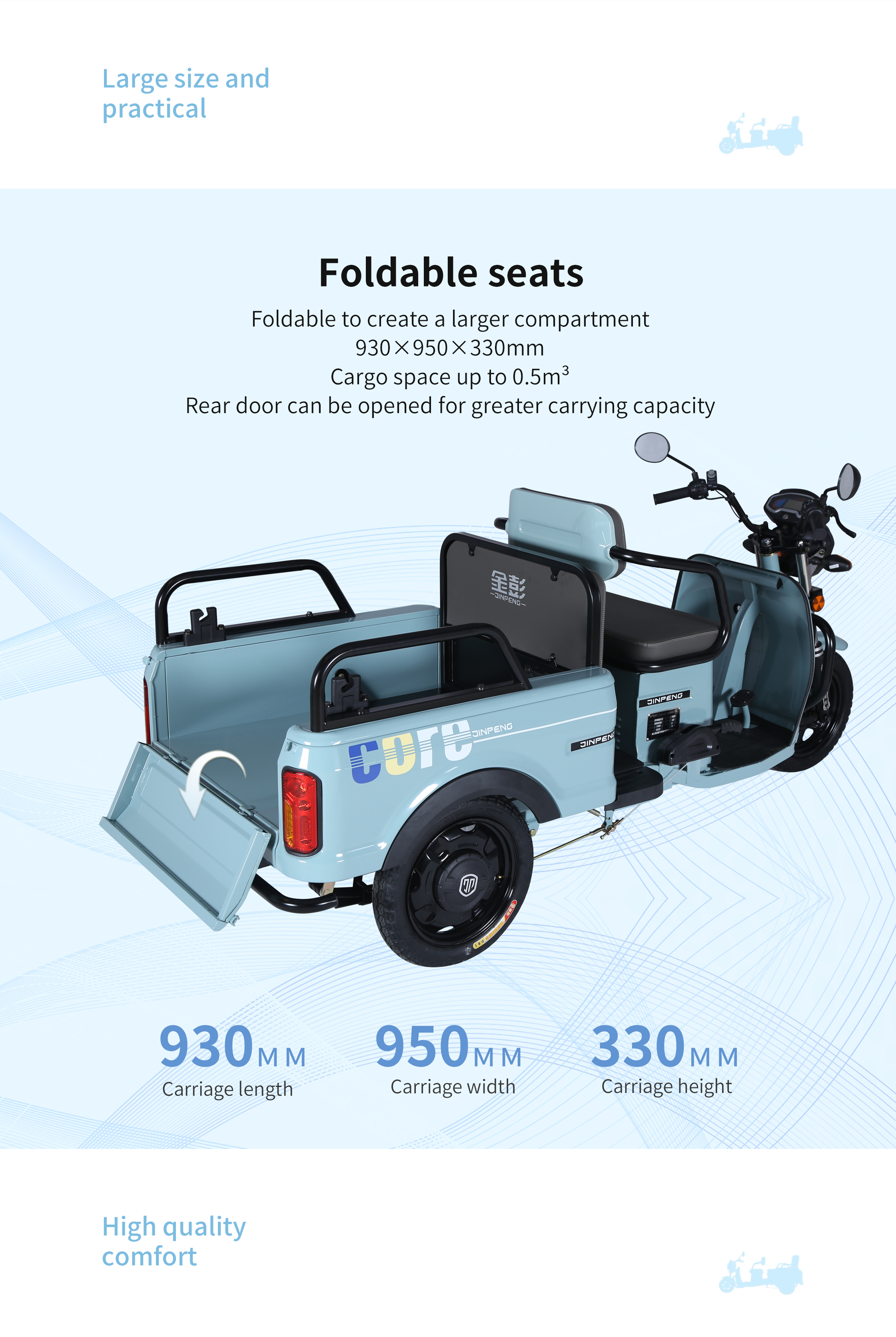 Cargo Box Size : The cargo box measures 930×950×330 mm and features a folding design. When folded. it serves as a cargo box suitable for carrying goods; when unfolded. it becomes a rear seat that can accommodate two passengers. offering flexibility for various needs.