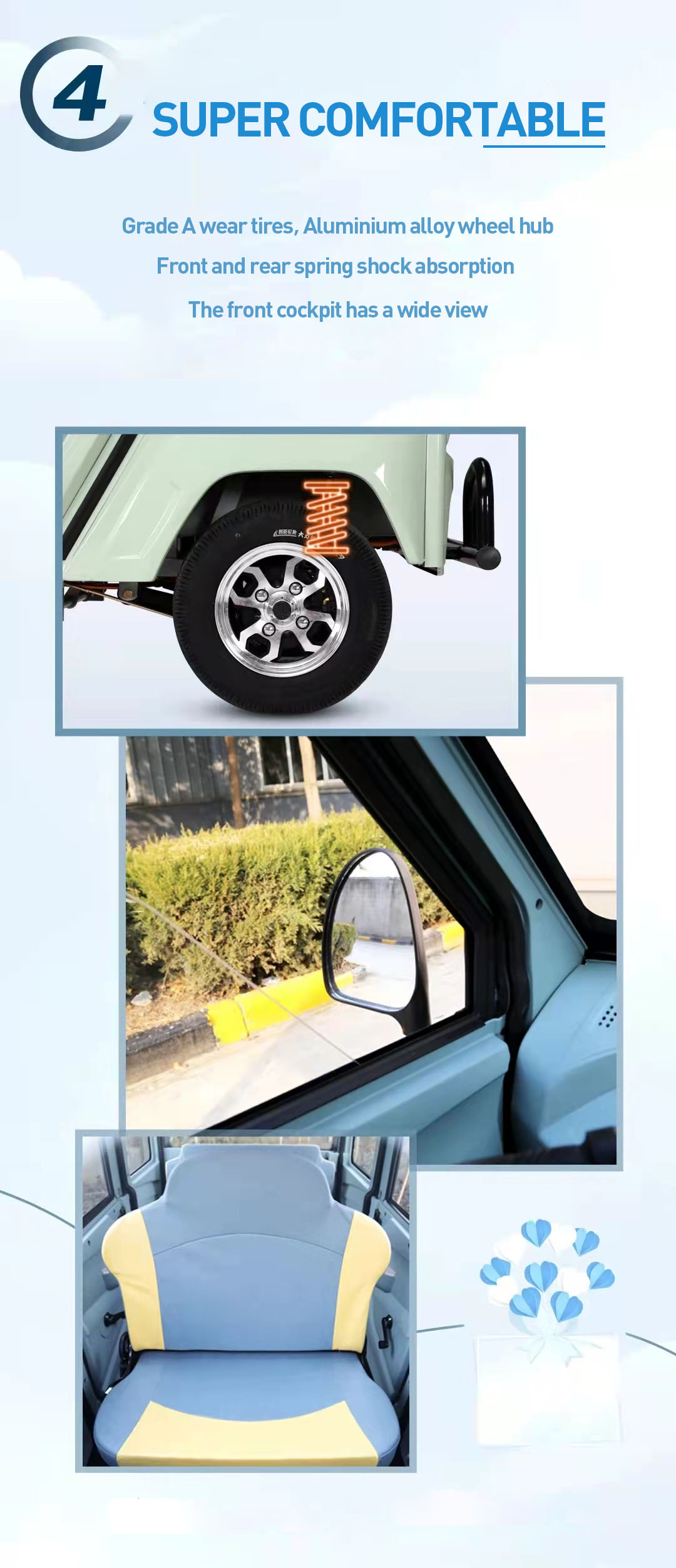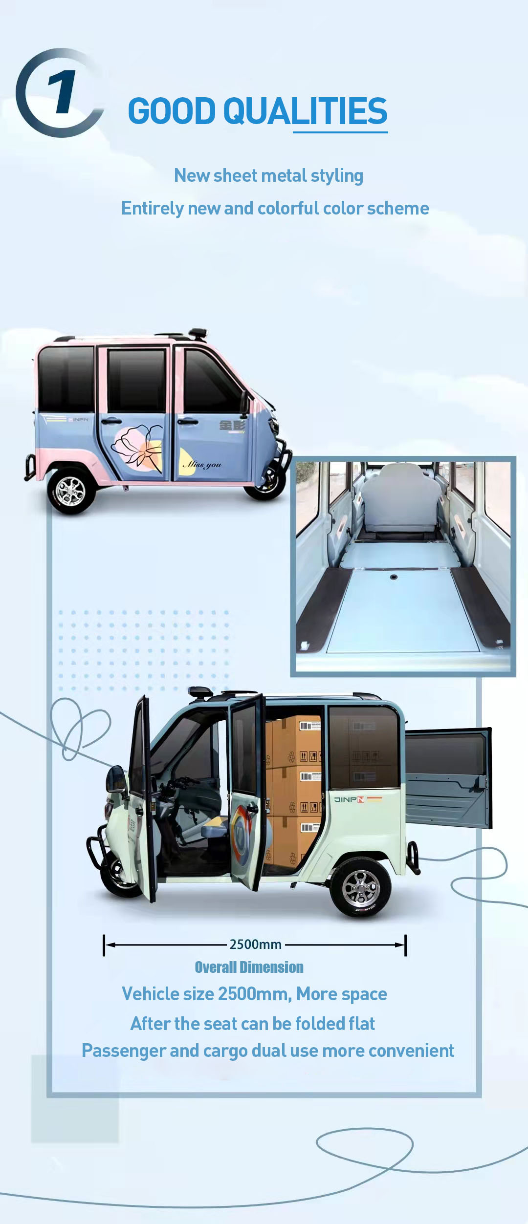 Large space: The entire vehicle size is 2500*1195*1670mm and the vehicle length is 2.5 meters. which makes the vehicle feel larger. The rear seats can be folded to increase cargo space.