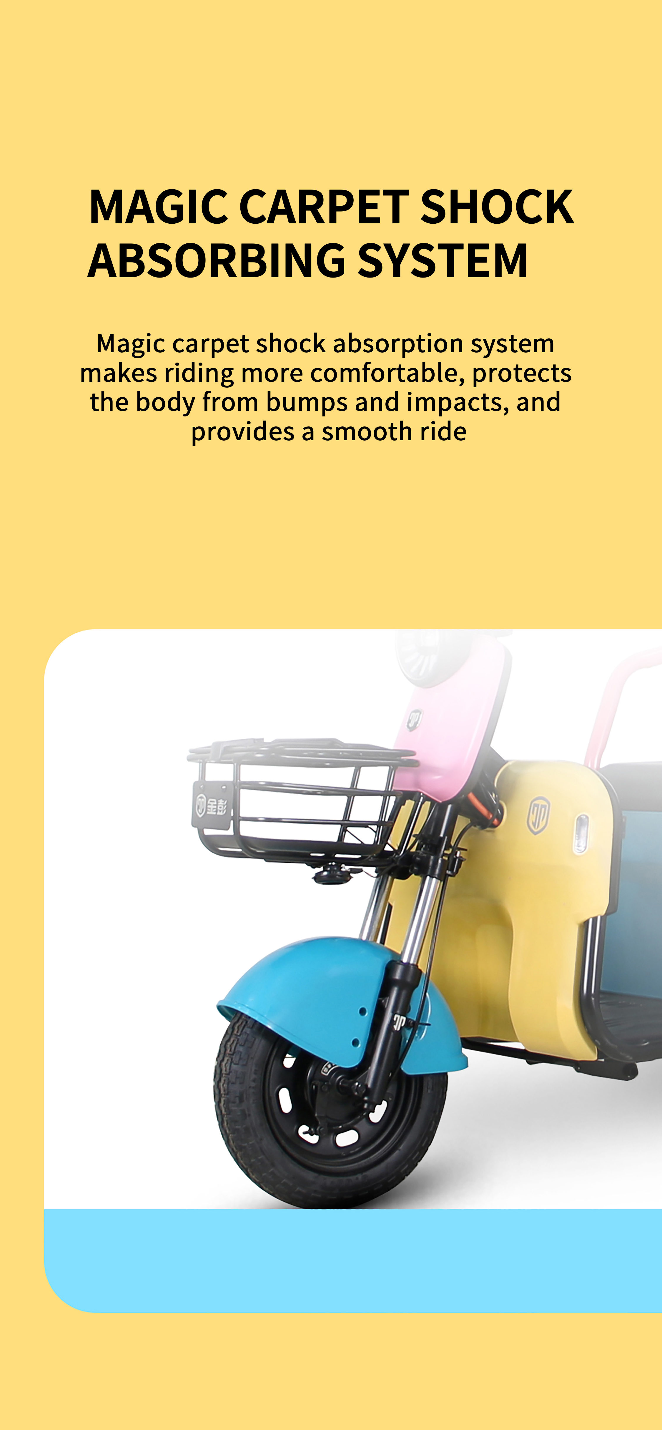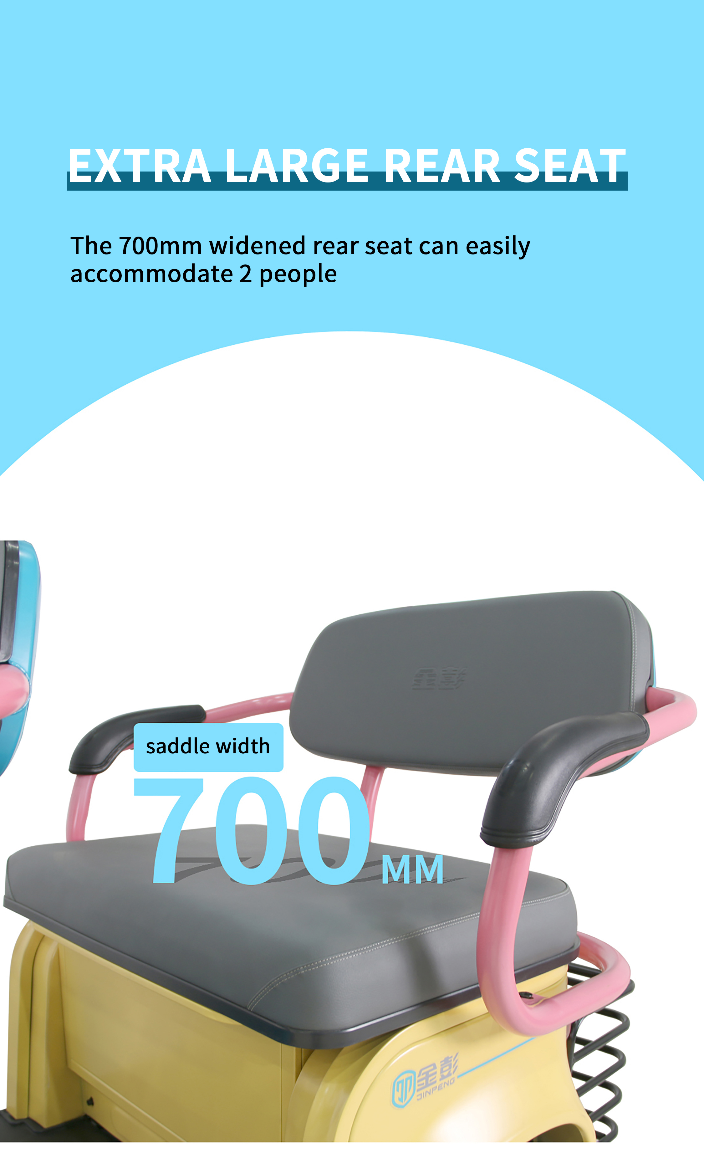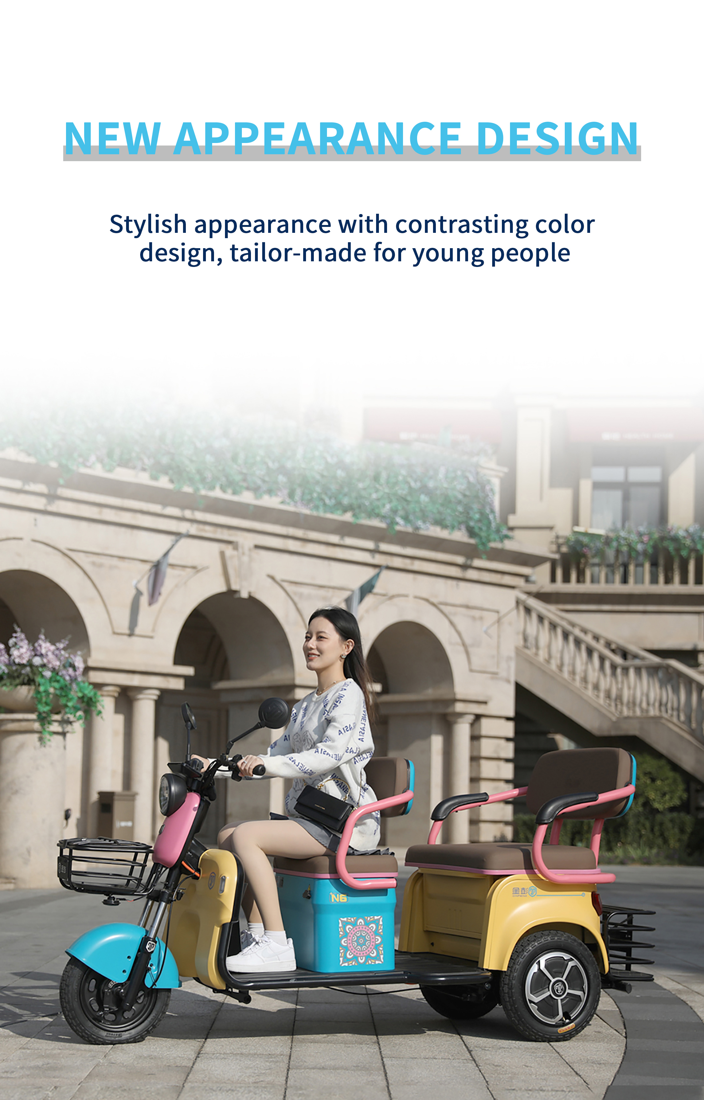 Fashionable Appearance : The Jinpeng N10 features stylish color schemes and a sleek design. making it stand out among other tricycles and becoming a bright sight on the streets.