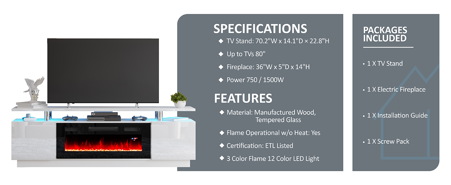 DetailBrand:AMERLIFEPower Source:Corded ElectricProduct Dimensions:14.4"D x 70.2"W x 22.6"HMaterial:Engineered WoodFinish Type:High Gloss & Matte whiteInstallation Type:FreestandingHeat Output:5100 British Thermal UnitsSpecial Feature:70" Modern High Gloss, Adjustable Flame&LED, Temperature Control & Time Setting, 36" Electric Fireplace, 2 Tier DesignStyle:ModernColor:White & Black