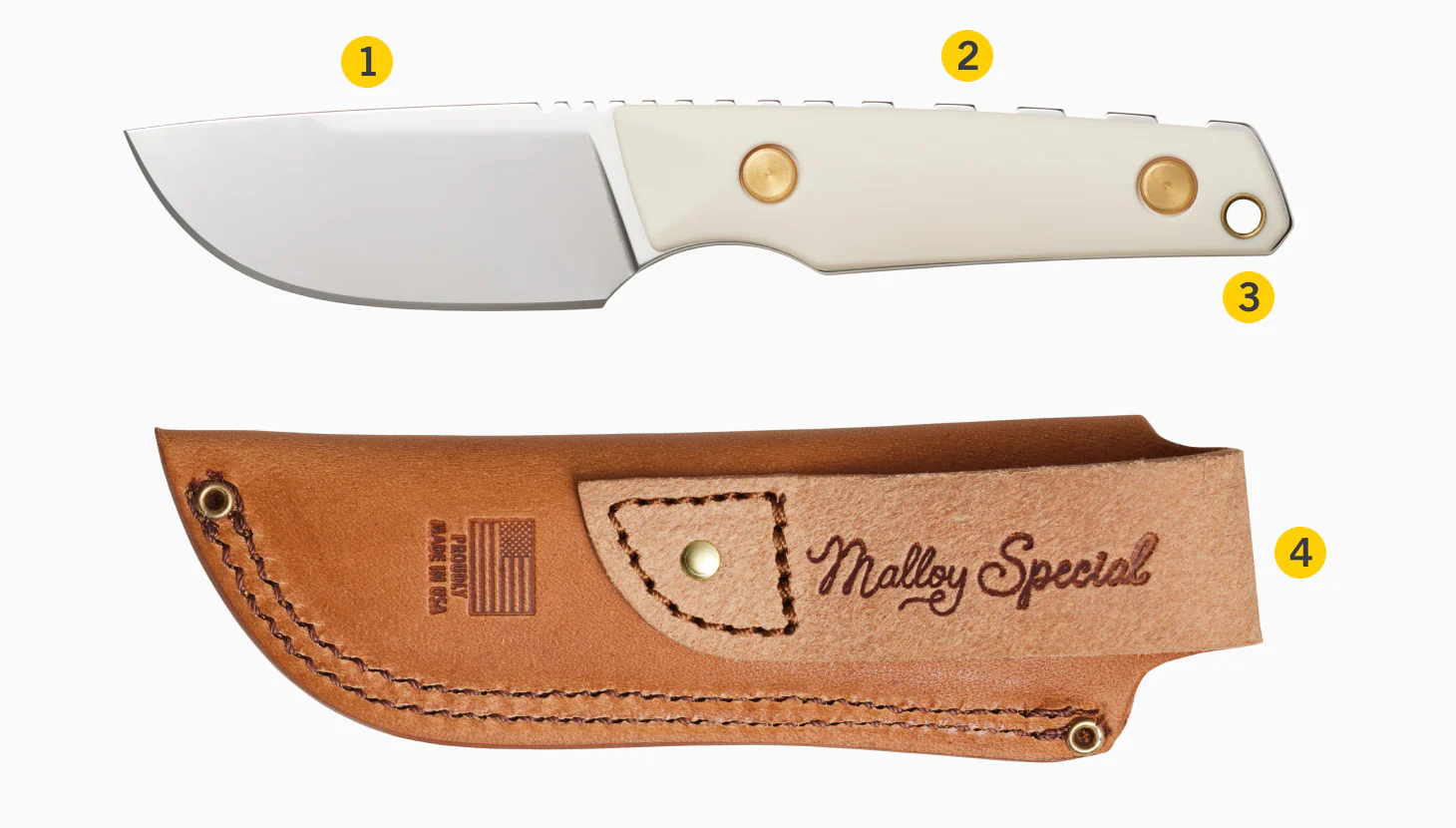 - 04Custom Leather SheathFeatures oil-rubbed, full grain, vegetable-tanned leather made in the USA.